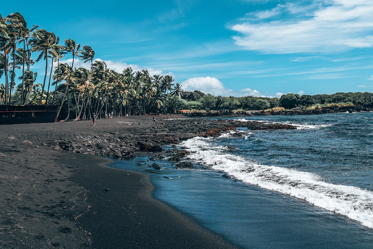 Punalu’u est une plage de sable noir au sud de Big Island. L’endroit est vraiment magnifique avec les palmiers, le noir du sable et le plan d’eau en arrière-plan entourée de végétation. La cerise sur le gâteau est que nous avons vu une tortue sur la plage. Il est possible de se baigner et de faire du snorkeling.