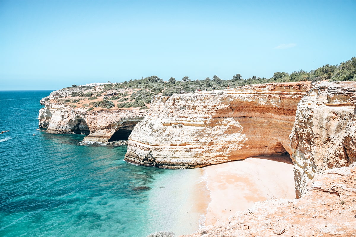 Praia da Marinha est souvent le point de départ de la randonnée des 7 vallées suspendues. C’est un peu la carte postale du coin et l’on comprend vite pourquoi avec la plage entourée de falaises mais aussi un peu plus loin cette double arche creusée dans la falaise. À Praia Da Marinha, vous pourrez découvrir de nombreux points de vue sur les falaises ocre distinctifs, les formations géologiques rouge orangé, les arches surgir de l’océan, mais aussi les plages en contrebas. Il est possible de se balader tout le long de la côte grâce au sentier des vallées suspendues vers Carvoeiro (sans doute la partie la plus belle) mais vous pouvez décider aussi depuis Praia da Marinha de partir de l’autre côté vers Porches (jusqu’à Praia Nova). Sachez qu’il est aussi possible de tout simplement peaufiner son bronzage à Praia da Marinha en profitant de l’endroit comme il se doit.