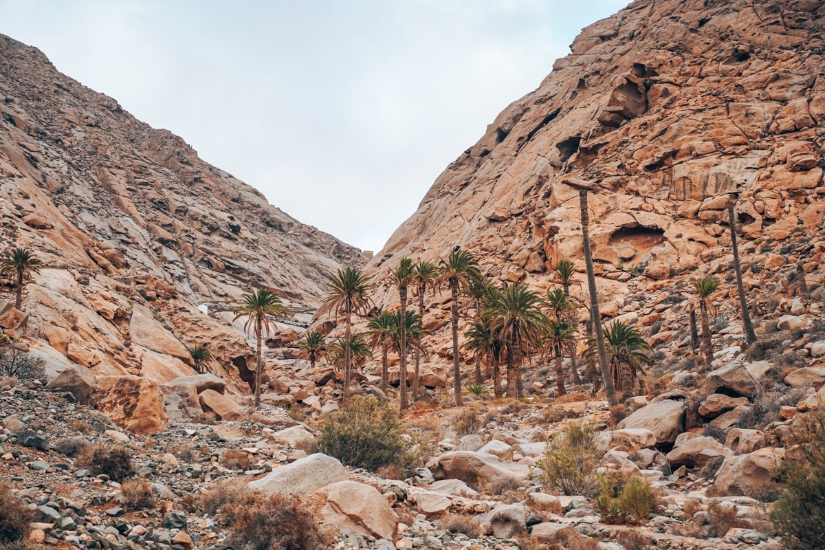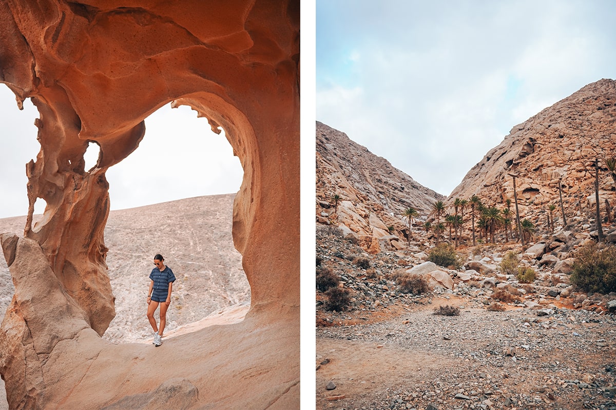 Arco de las Penitas est l’une des cartes postales de Fuerteventura. En effet, cette arche coincée entre deux rochers au milieu des montagnes (et de nulle part) est un joli lieu à découvrir. L’endroit est encore assez mystérieux car l’accès n’est vraiment pas facile et surtout pas balisé. Pour revenir au spot en lui-même, nous avons trouvé l’endroit magnifique dans un décor complètement désertique. On y voit d’anciennes habitations, une toute petite chapelle blanche (Ermita de la Pena) et des palmiers en contrebas des montagnes. Pour atteindre Arco de las Penitas, il vous faudra environ 1h aller/retour en vous garant ici et en essayant de vous guider par vous même grâce à l’application Maps.Me. Pour atteindre Arco de las Penitas, nous vous conseillons de suivre un petit chemin visible sur le début de la randonnée puis de grimper vers le gros rocher (c’est là ou se trouve le spot) en allant en direction d’une sorte de grotte plus ou moins visible d’en bas. Bref, ce n’est pas facile, essayez de suivre au maximum les sentiers déjà établis par les précédents randonneurs en vous mettant en tête que c’est en haut du gros rocher. Maps.Me vous aidera pour vous orienter un minimum.