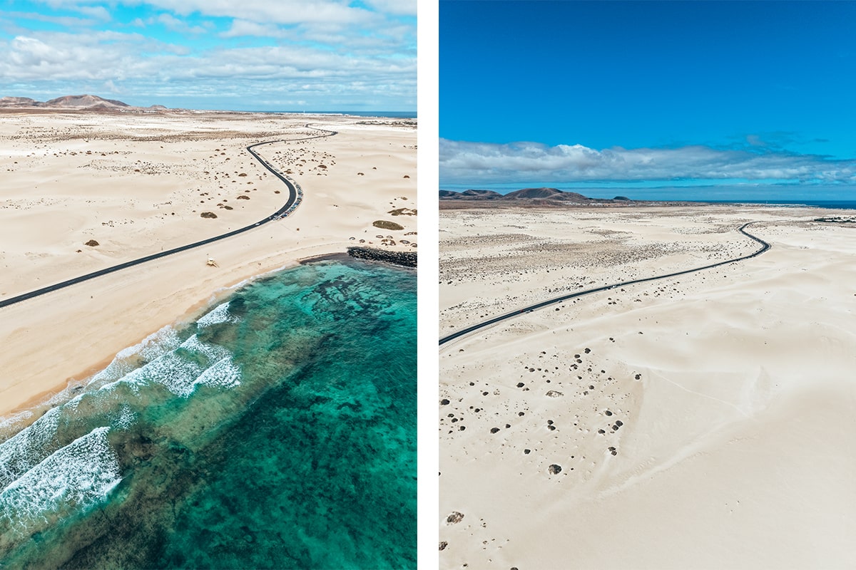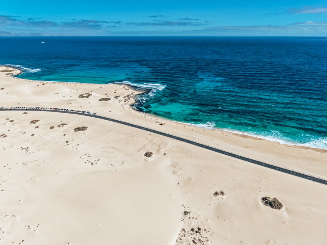 Les dunes de Corralejo sont un incontournable à découvrir lors d’un voyage à Fuerteventura. Le paysage est à couper le souffle avec les dunes qui se jettent dans l’océan à l’eau turquoise. Tout le long de la route, on en prend plein les yeux avec ces étendues de sable, les plages incroyables, l’eau bleue parfaite pour la baignade et au loin les montagnes et volcans. D’ailleurs au début (ou à la fin) de la route se trouve la Montana Roja qui se fond bien dans le décor. On peut passer facilement la journée ici pour profiter des plages et même pour se balader directement sur les dunes (possible seulement d’un côté de la route). La playa del Moro et la playa del Dormidero sont des pépites pour poser sa serviette. Pour marcher sur les dunes, les alentours de la playa Larga sont une bonne option.
