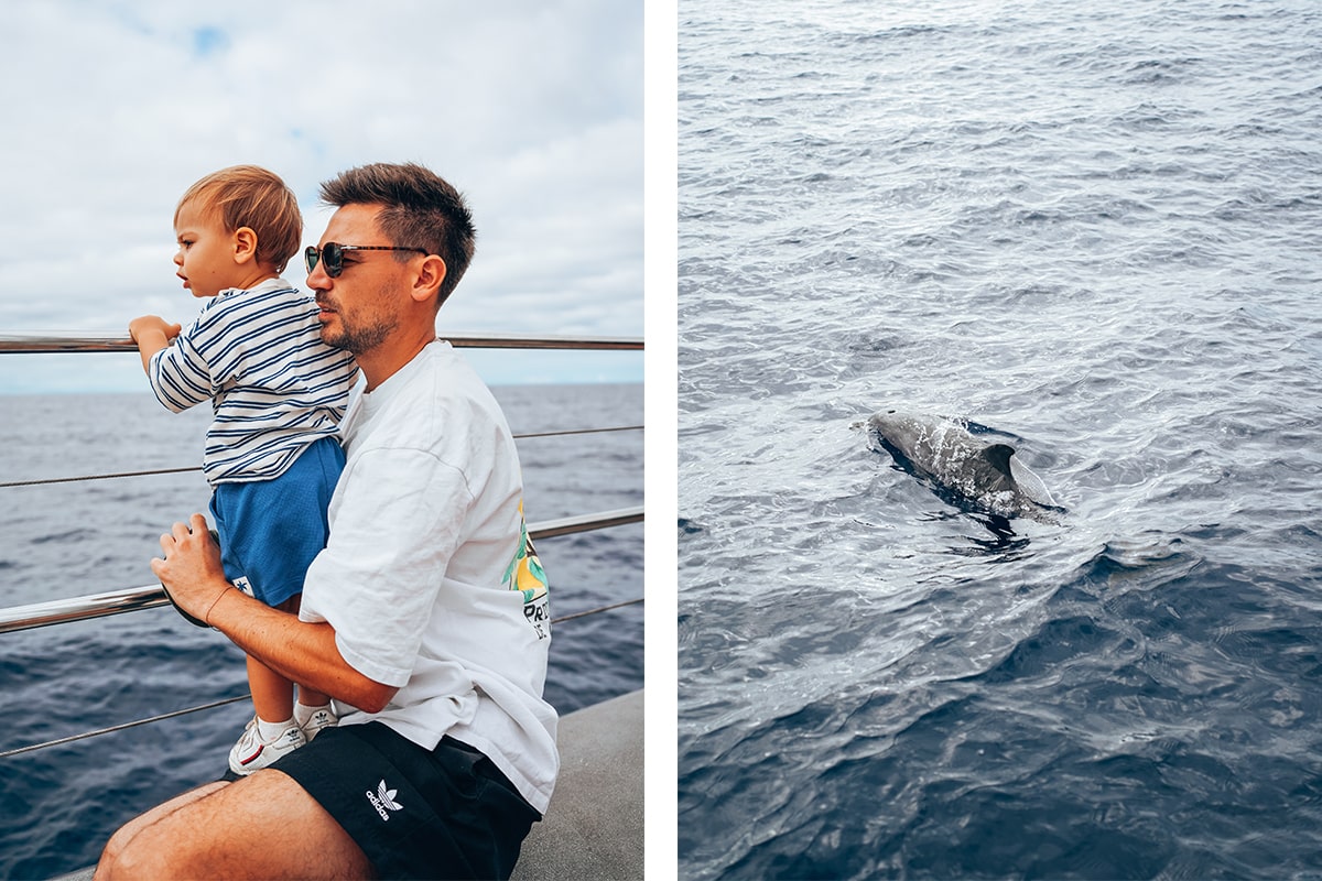 Aujourd’hui, nous partons pour une excursion en catamaran à Fuerteventura dans le sud de l’île. Départ depuis le port du village de Morro Jable pour 4h de navigation avec l’agence Magic. Nous avons été gâtés dès les premiers instants avec des centaines de dauphins encerclant le bateau pour notre plus grand plaisir. Tout au long de l’année, il est aussi possible de voir des baleines mais nous n’en avons pas vu cette fois-ci. Les deux dernières heures, le catamaran a posé l’ancre pour une pause baignade et pour manger ce que le capitaine et ses acolytes nous avaient concocté. Nous sommes restés plus ou moins près des côtes de Morro Jable et nous étions une trentaine à bord. Les équipes du Magic mettent pas mal l’ambiance avec de la musique, de l’humour et des moments sympas. Dernière information au niveau du port de Morro Jable, il n’est pas rare de voir des raies manta depuis les pontons. Nous avons réussi à en voir une furtivement et c’est toujours un plaisir.