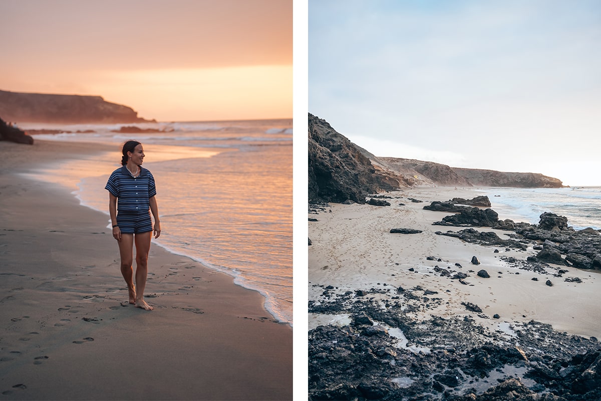 Aujourd’hui, nous commençons par un lever de soleil sur la Playa Esquinzo-Butihondo qui se trouve juste à côté de notre hôtel. Nous sommes situés parfaitement à l’est pour profiter des premières lueurs du soleil. La longue plage avec son eau turquoise est incroyable pour se balader, poser sa serviette et aller se baigner. Etant donné que la plage se trouvait à deux pas de notre hôtel, nous y allions souvent en fin d’après-midi pour nous baigner et c’était juste idéal en famille.