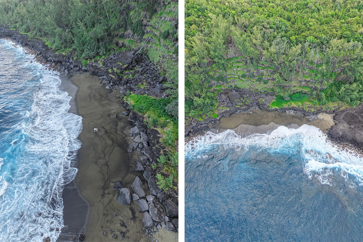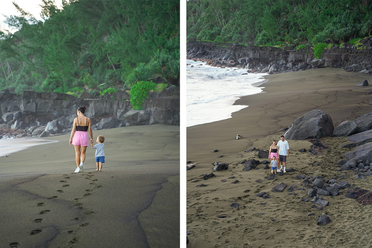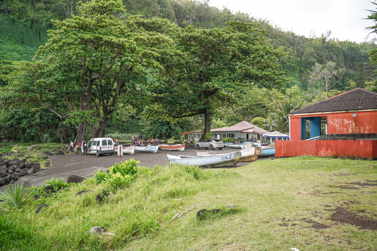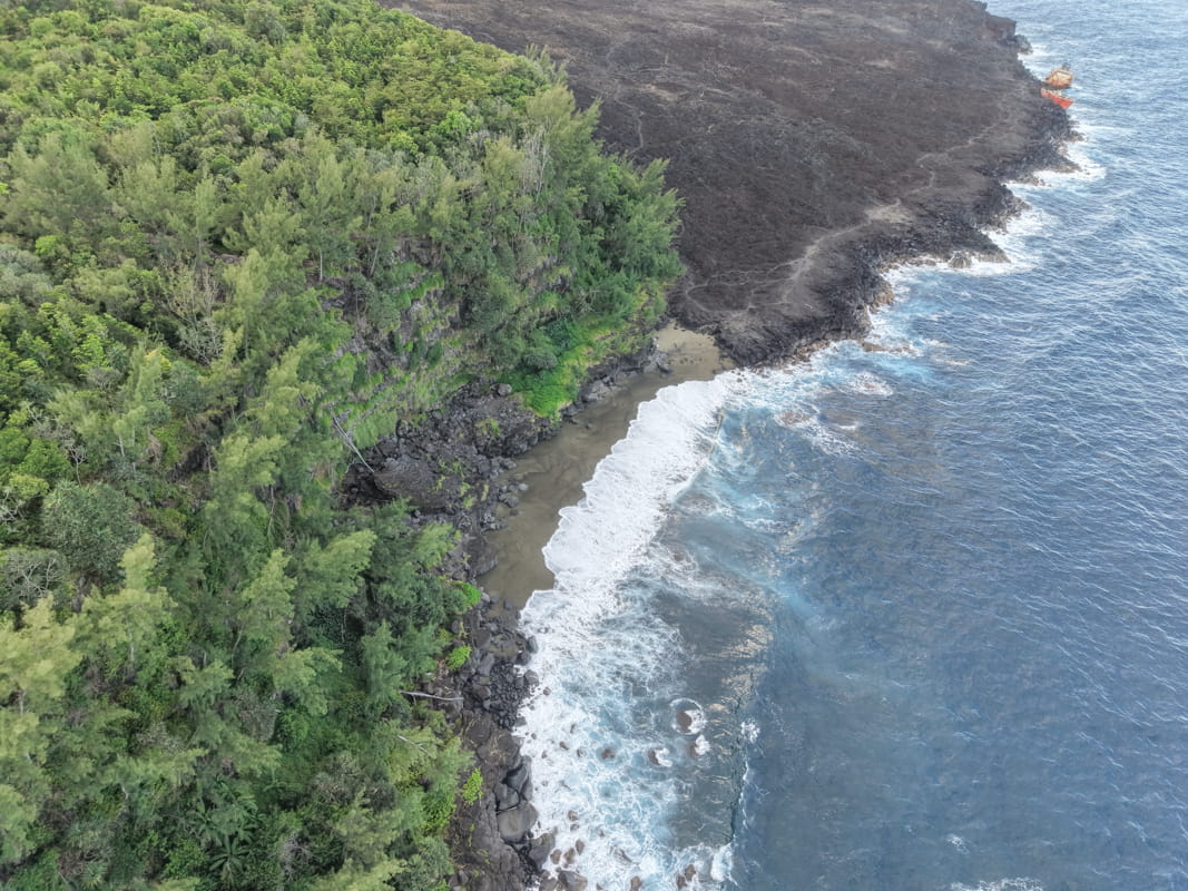 La plage de Tremblet est insolite dans le sens où c’est la seule plage de sable vert que nous ayons vue sur l’île de la Réunion. Nous étions seuls au monde ici pour notre plus grand bonheur. Le sentier pour y accéder reste assez simple malgré quelques passages délicats. Il vous faudra une petite demi-heure pour y descendre et le même temps pour remonter. Pour l’anecdote, lors des jours de fortes pluies, la plage se retrouve surplombée par de nombreuses cascades. On peut imaginer que ce soit un moment unique et hors du commun qu’il ne faut pas rater. Lors de notre passage, il n’y avait même pas d’eau qui coulait des falaises. Si vous continuez un peu le chemin depuis la plage du Tremblet, il est possible de voir de loin le bateau échoué depuis 2022 (Tresta Star) sur les roches volcaniques. On peut aussi distinguer une des anciennes coulées de lave du Piton de la Fournaise juste à côté.