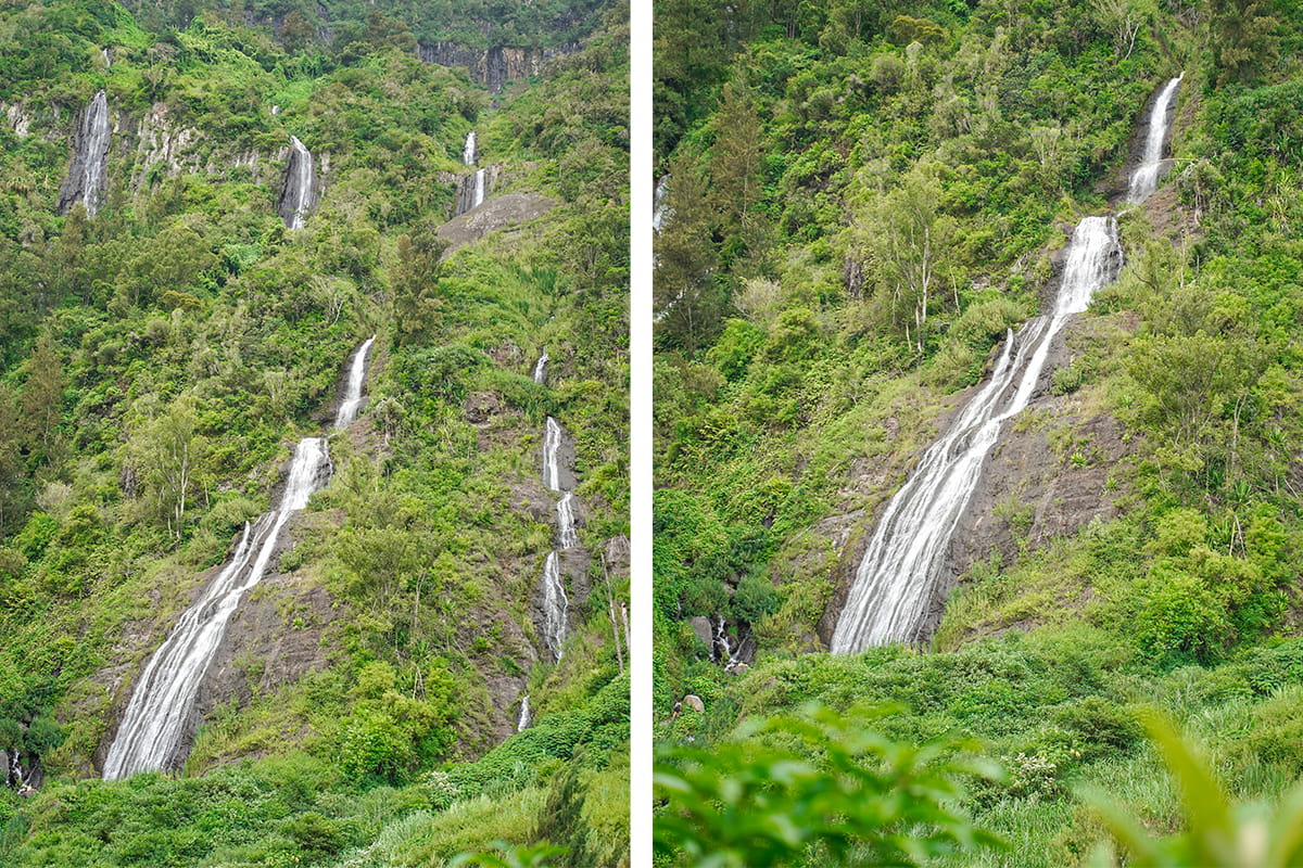 En recevant sur la route après le village de Salazie, point de vue permet de découvrir 7 cascades qui se jettent dans la rivière en contrebas depuis les hauteurs de la montagne. Les 7 cascades comprennent celle du Voile de la Mariée qui est au final une petite portion de l’ensemble des cascades qui coule sur le flanc vert de la falaise. Le point de vue depuis la route s’appelle « Parking des 7 cascades ». Il y a quelques places sur le bord de la route pour se garer.