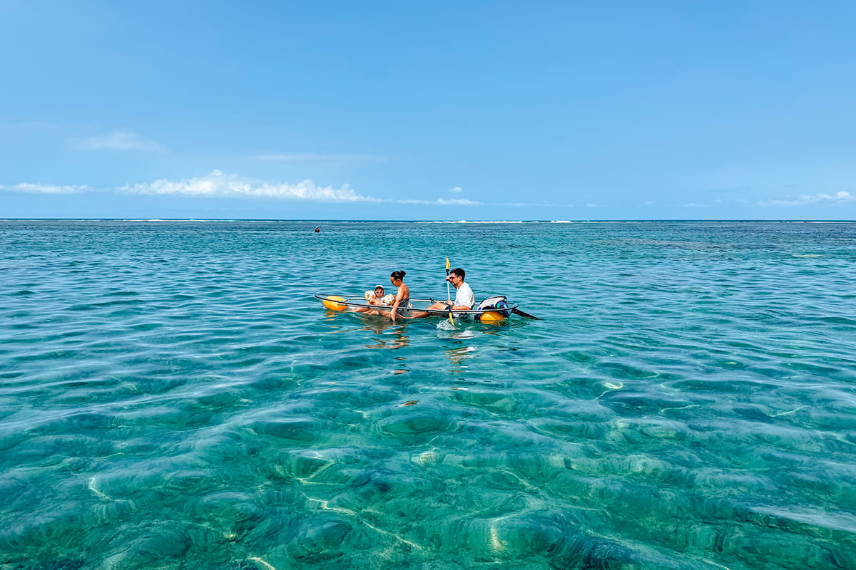 Ce matin, nous partons direction la plage du trou d’eau pour tester une excursion en kayak transparent. En effet, la plage du trou d’eau se trouve non loin de la plage de l’Hermitage et possède le même lagon. Grâce au kayak transparent, il est possible de découvrir les fonds marins et les coraux sans trop d’effort. C’est une activité parfaite en famille et notamment avec un bébé pour découvrir le lagon autrement et surtout voir ce qui se cache sous l’eau. Il est possible de faire du kayak transparent en autonomie ou avec un guide qui vous mènera sur les meilleurs spots tout en vous donnant plein d’explications sur le lagon.