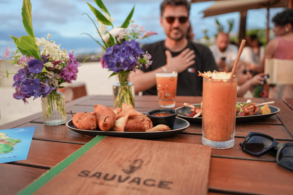 En fin de journée, nous avons fait un petit détour direction le restaurant Sauvage à Saint Paul. Nous voulions profiter du coucher de soleil les pieds dans le sable tout en dégustant un bon cocktail. Et c’est le lieu parfait pour ça. L’ambiance est vraiment cool, les gens sont sympas et nous avons même fini par diner ici. La carte est vraiment qualitative et son emplacement en fait l’un des incontournables de l’île.