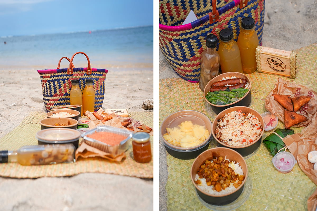 Pour le déjeuner, nous avions prévu de nous faire livrer un pique-nique (véritable tradition sur l’île de la Réunion) directement sur la plage par Alison de Soubik Piknik. On s’est tellement régalé avec des produits locaux et faits maison. Tout était bien préparé avec un grand panier et un tapis (que vous pourrez rapporter avec vous). Bref, si vous avez l’occasion, on vous conseille de tester le pique nique d’Alison.