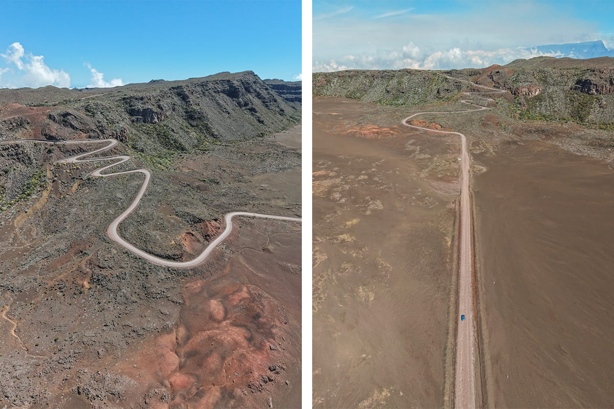 La Plaine des Sables est un lieu lunaire juste avant d’arriver près du Piton de la Fournaise. Le paysage est à couper le souffle et la route qui traverse la plaine est juste folle. Les couleurs volcaniques sont sombres mais on y distingue à l’apparition du soleil des dégradés beaucoup plus clairs qui donnent des camaïeux de rouge très sympas. La Plaine des Sables regroupe des cônes, des pitons et de nombreuses curiosités géologiques résultant de l’activité volcaniques. Difficile de ne pas être époustouflé par ces paysages devant nous à plus de 2200 mètres d’altitude.