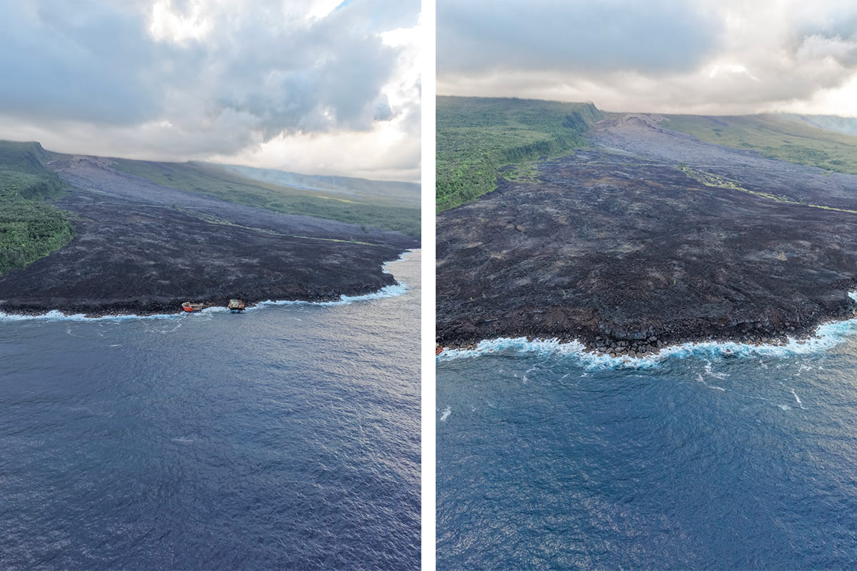 Côté Saint Philippe, nous partons découvrir la route des laves jusqu’à la coulée qui a coupé la route (2026). Nous avons la chance de voir la lave couler depuis les hauteurs et c’est un moment incroyable. Au-delà de l’éruption en cours, nous pouvons aussi profiter des paysages modifiés par les anciennes coulées. C’est encore une fois un moment à part.